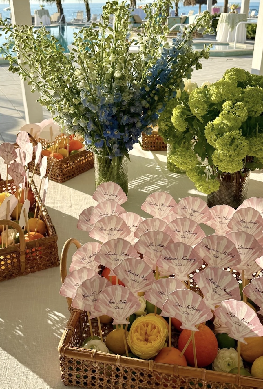 So fun seeing our custom escort cards for the wedding down at the Gasparilla Inn this past weekend. The bride went with these cute pink die cut shells, and I love how they were displayed with all the citrus fruits and florals!
