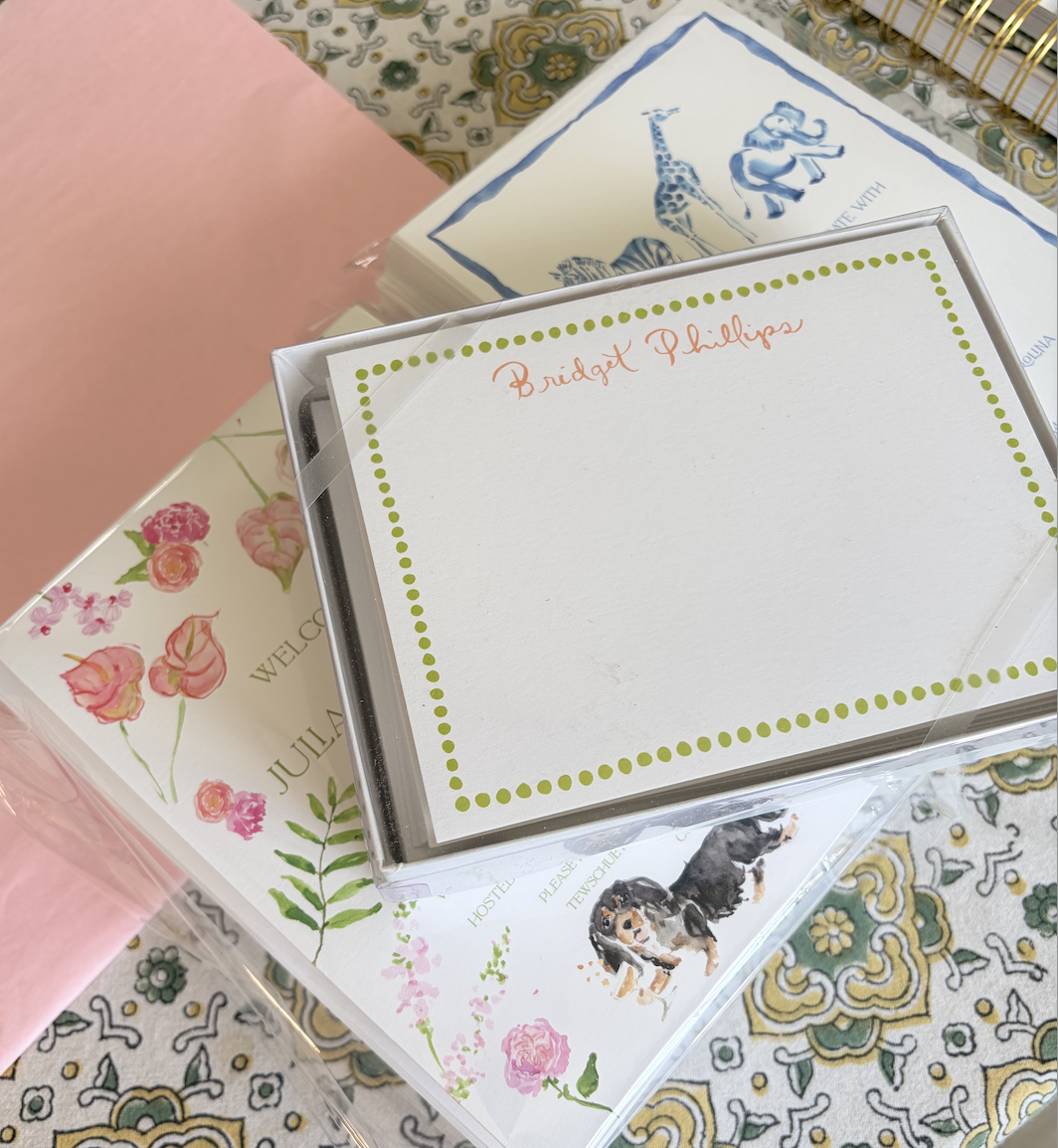 A delivery that included our fun dot dot dot stationery! Each name on this design is personally handwritten :)